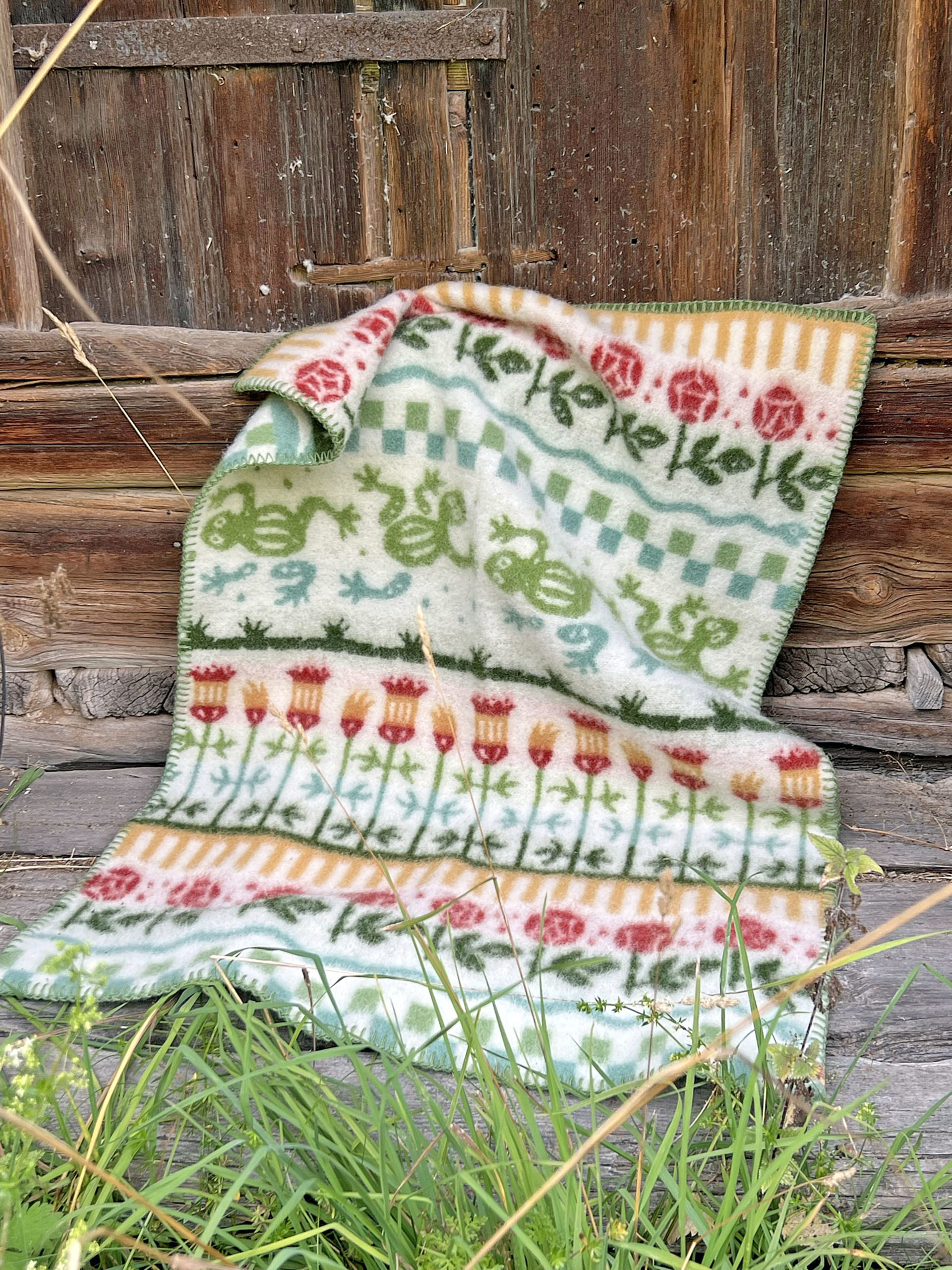 Barnfilten ESBJÖRN är precis som ullfilten KARIN en hyllning till Karin Larssons formgivning och textilier i hemmet i Sundborn. Broderade kuddar och dukar, vävnader och inredningens färgsättning har inspirerat till de olika mönsterbårderna. Esbjörnfilten är tillfälligt slutsåld men kommer in igen i slutet av november -24.